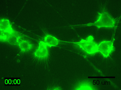 Time-lapse imaging of N1E-115 cells stained with PlasMem Bright Green diluted 200-fold in medium for 30 min.